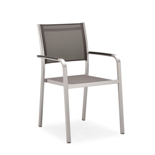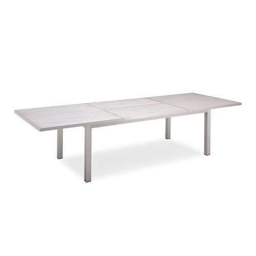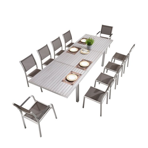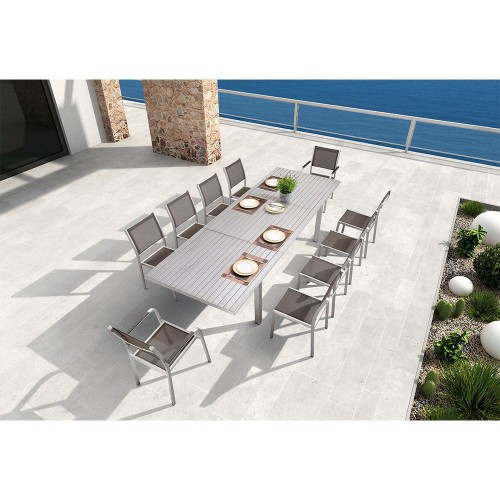Cu un design elegant, deosebit, setul DIONIS LUX este realizat din aluminiu slefuit si este format din masa extensibila, 2 scaune din textilen cu brate din HDPE si 8 scaune fara brate din textilen.